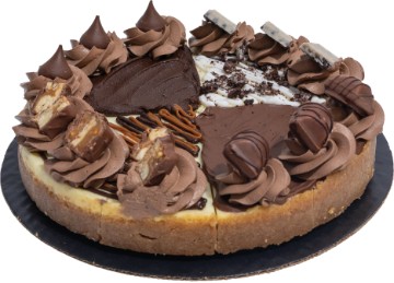 <p>Serves 14-16. Rich and creamy cheesecake with a velvety smooth filling and buttery graham cracker crust with 4 sections of chocolate toppings; chocolate icing with chocolate kisses, Nutella spread with Kinder Bueno minis, Vanilla icing with cookie crumbs and Cookies n Creme bars, and caramel spread and chocolate icing, with Snickers bars. All topped with chocolate whipped icing.</p>