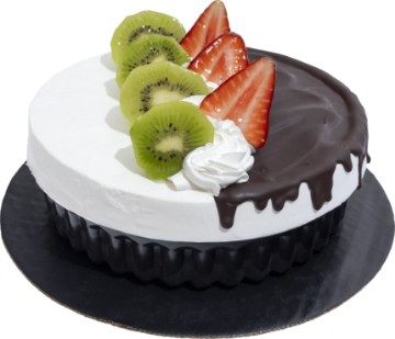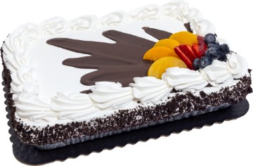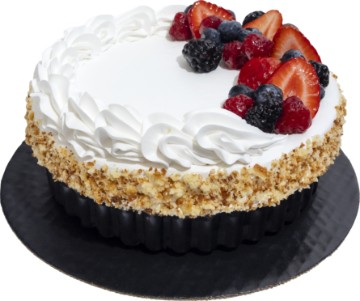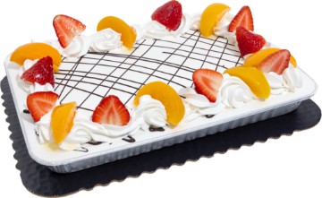 <p>Serves 14-16. 2 layers of vanilla Tres leches rounds, filled with creamy Bavarian cream and iced with fluffy whipped icing. Choice of Berries with White Crumbs or Strawberries, Peaches, and Chocolate Drizzle.</p>