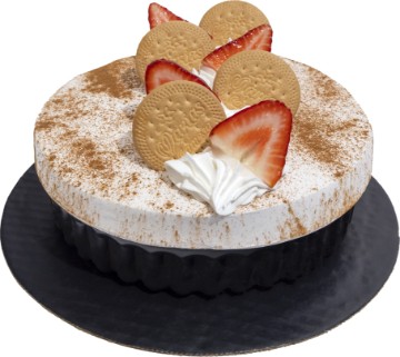 Serves 14-16. 2 layers of vanilla Tres leches rounds, filled with creamy Bavarian cream and iced with fluffy whipped icing. Choice of Berries with White Crumbs or Strawberries, Peaches, and Chocolate Drizzle.